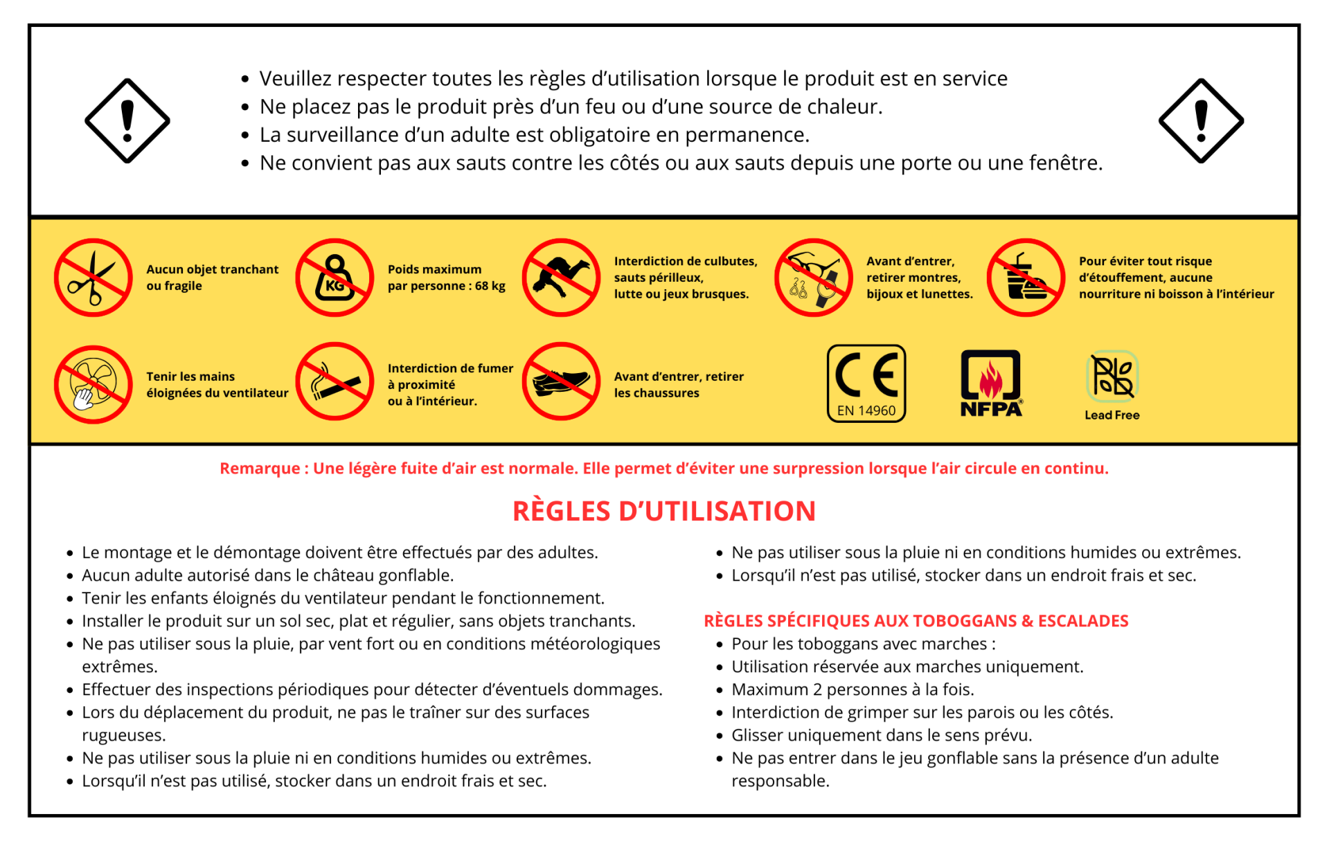 Jumpi’Color combine un grand espace de saut, des obstacles gonflables intérieurs pour grimper et contourner, ainsi qu’un toboggan latéral qui apporte rythme et variété à l’expérience. Sa conception ouverte permet aux enfants de circuler librement entre les différentes zones de jeu, tout en garantissant une excellente visibilité pour les adultes.
